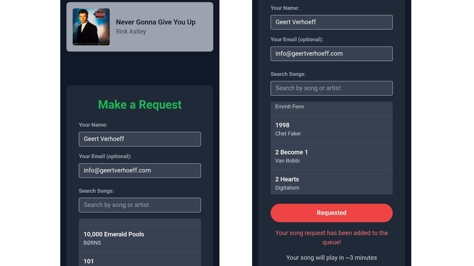 - Data is king, so it would save, but I never implemented this function fully, the name and email of every person that would request a song. Maybe you could use it later to send a concert invite? Just an example. Having contact of guests could potentially help with promoting other things later on.