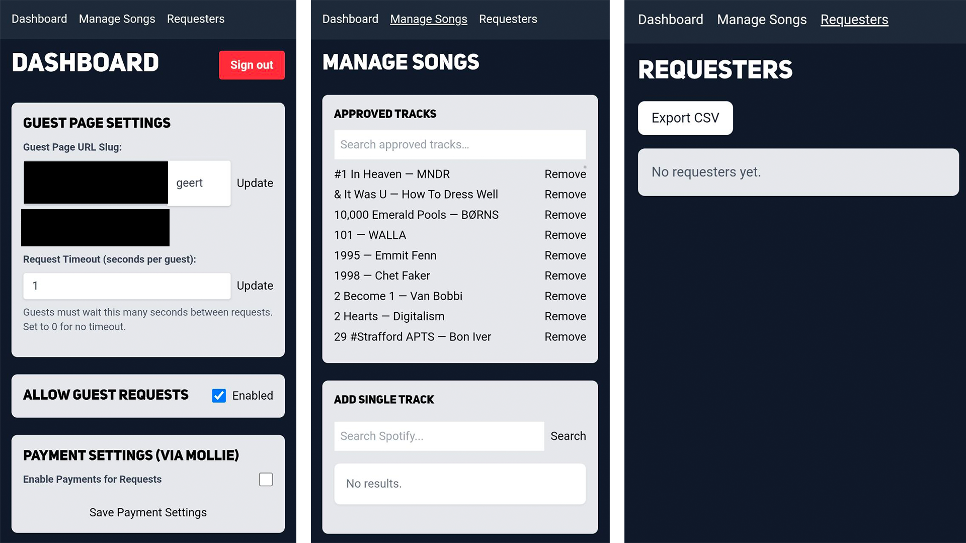 After logging in with Spotify, so I could already scale it without people needing to make accounts separately, the party owner would see a dashboard where he/she could setup and see the following on 3 separate pages: